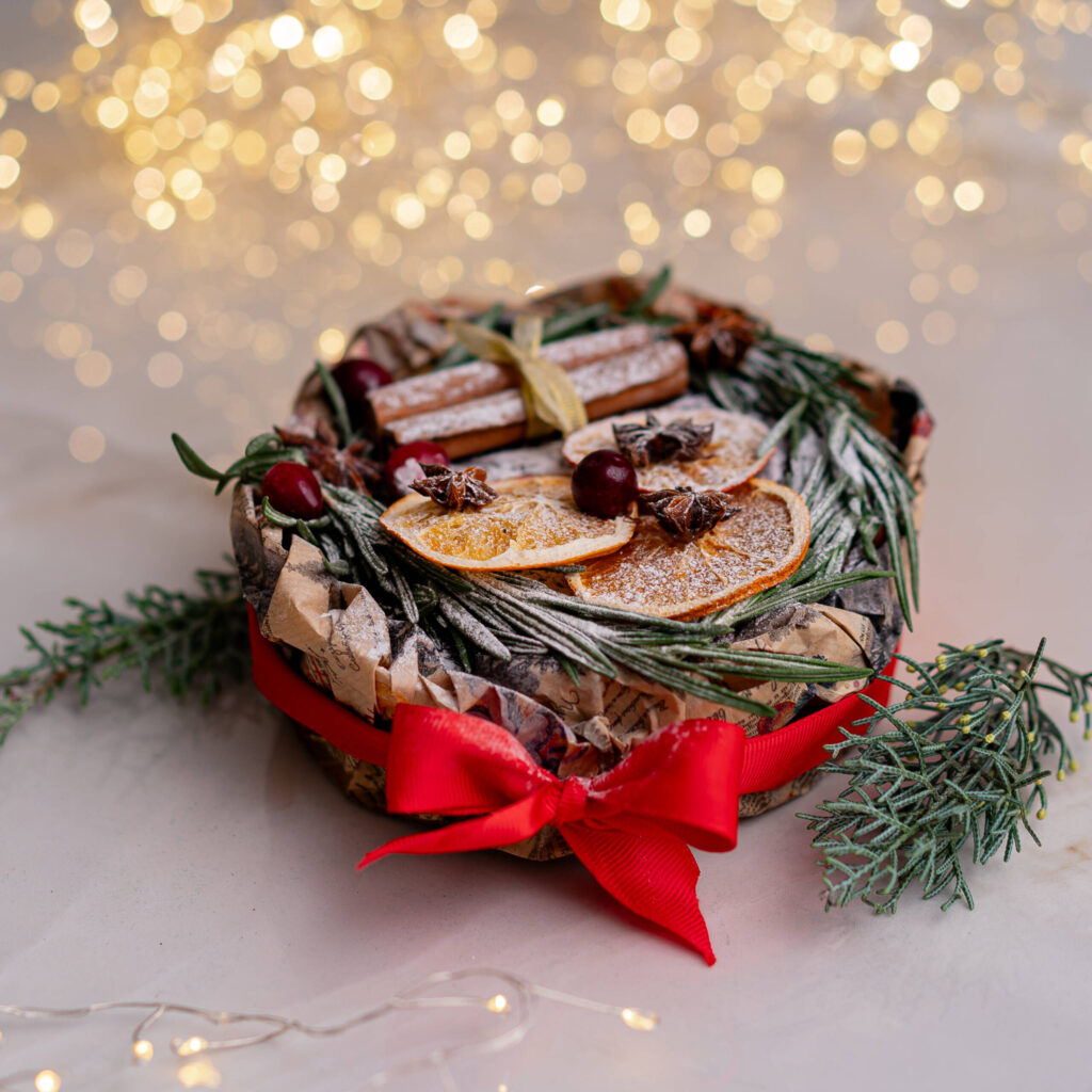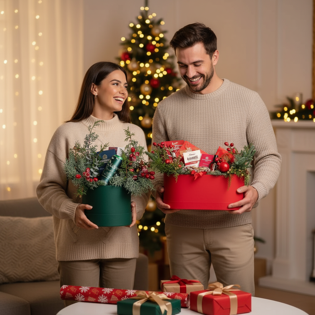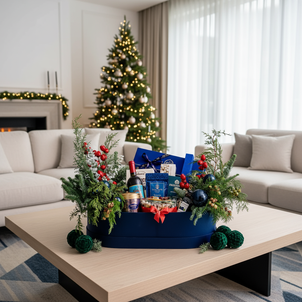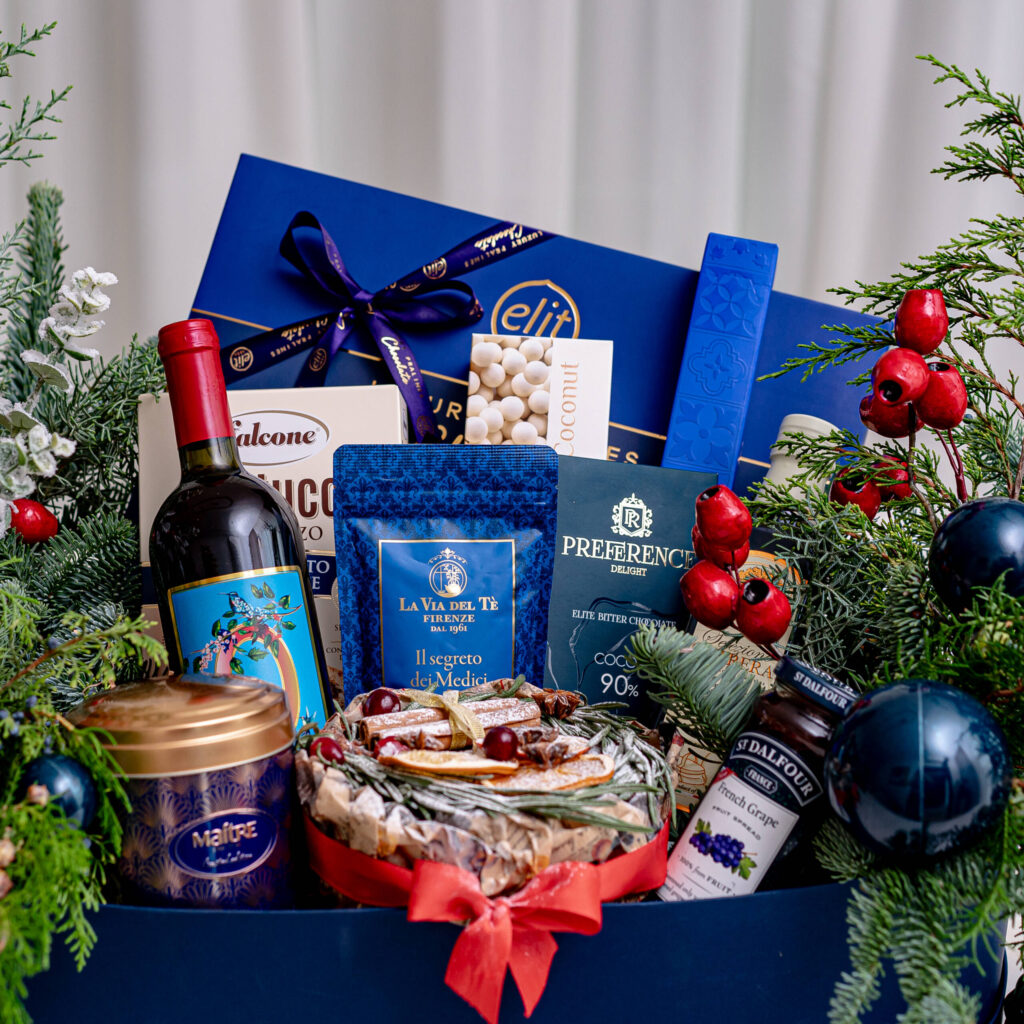 В основе каждого подарка лежат живые цветочные/хвойные композиции. Дополняют подарок гастрономические деликатесы от премиальных производителей.