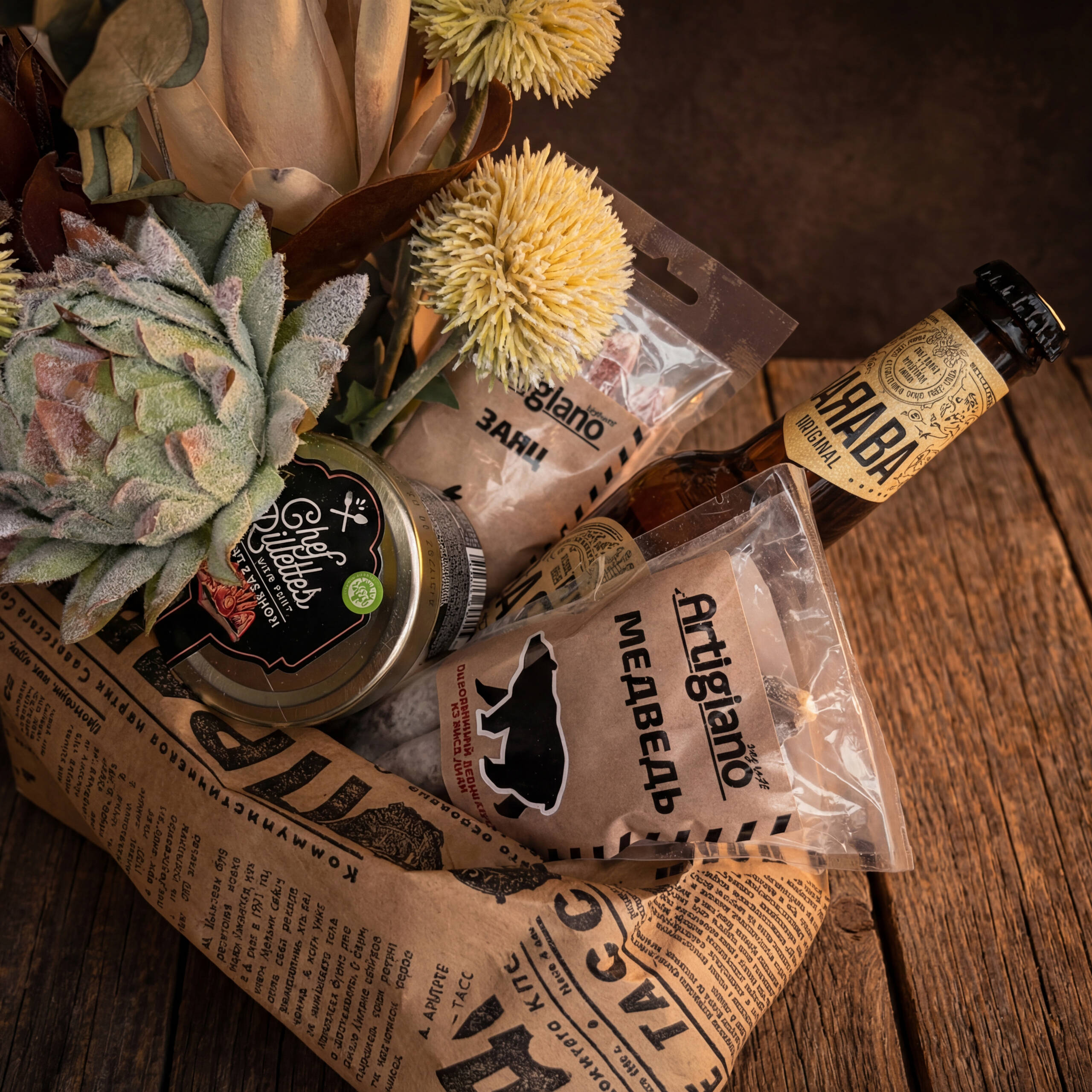 Эксклюзивная симфония вкусов дикой природы. Колбасы из мяса медведя и зайца в тандеме с нежным риетом из камчатского краба. Идеально дополнено хмельным напитком —  чтобы ничто не отвлекало от наслаждения.